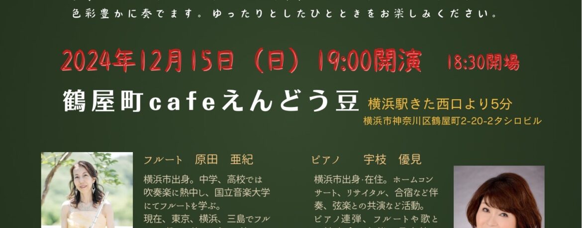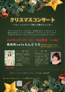 柔らかく澄んだフルートの音色と、表情豊かなピアノのデュオで、耳馴染みのあるクラシックから映画音楽、そしてクリスマスソングなど、色彩豊かに奏でます。ゆったりとしたひとときをお楽しみ下さい。