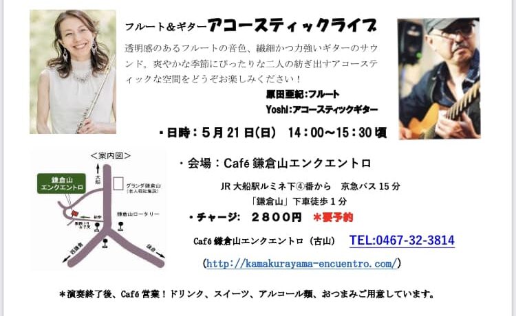 5月のコンサートライブのお知らせです。 5/21日曜日、鎌倉山のカフェで、 ギター(アコギ)のYoshiさんとフルートで なんと4年ぶりのライブ開催します!(以前予定していたのに、コロナで流れたのでした、、) 前回は、窓 […]