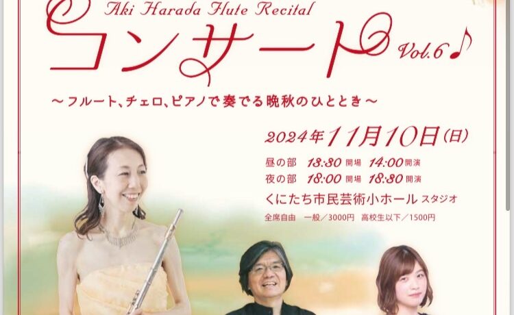 2024年11月10日(日曜日) くにたち芸術小ホール、スタジオにて 『ホッとなコンサートvol.6〜フルートとチェロ、ピアノで奏でる晩秋のひととき』を開催致します。 前半は、ピアノとフルートのデュオの作品 […]
